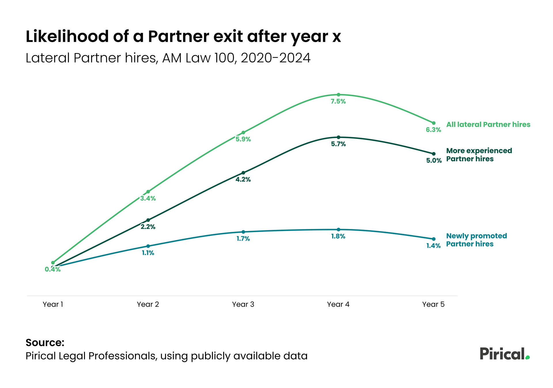 Partner retention is a vital metric for law firms so we've decided to take a look at how lateral Partner retention compares across the AM Law 100 and uncover the firms with the strongest retention rates over the last 5 years, as well as any key trends among the hires that ultimately don't work out. Using publicly-available data tracked by Pirical Legal Professionals (PLP) , we've analysed how many of the lateral Partner hires made by AM Law 100 firms between 2020-2024 are still at the firm. Note on methodology: excludes firms that made fewer than 10 lateral Partner hires and moves as a result of mergers. Data is derived from tracked lateral Partner moves, numbers may be slightly incomplete due to limited public information. Exits include Partners that left but didn't lateral to another firm, eg. retired.